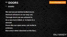 Life is like the double door, <br />Through one you walk IN <br />And through the other you GO! <br />Maintaining a balance in this continuous <br />flow ; <br />Or else the earth would be too crowded <br />for us to stand, <br />With no elbow room even to shake hands! <br /> <br />Like a river flowing in a continuous stream, <br />You hardly notice the changes within! <br />Yet you can never step into the same <br />water twice, <br />Remember the Greek Heraclitu’s advice! <br />Nature forgets an individual face, <br />It’s more concerned with continuance of <br />the human race! <br /> <br /> <br />(New Delhi/31 May 07)<br /><br />RAJ NANDY<br /><br />http://www.poemhunter.com/poem/the-double-door/