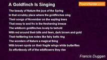 I heard a goldfinch singing at the twilight of the day <br />And it took me to another Land far north and far away <br />To the leafy grove by the river when the dawn was breaking gray <br />And the meadows scenting sweetly of the fragrant blooms of May. <br /> <br />The distinct song of the goldfinch a familiar song to me <br />By his voice I recognized him as him I did not have to see <br />At the verge of his borders on branch of horse chestnut tree <br />He carolled in the gray dawn to proclaim his territory. <br /> <br />I heard a goldfinch singing and I thought of my Homeland <br />And if you too are a migrant you like me can understand <br />How the song of a familiar bird bring you back thoughts of home <br />Though you love your adopted Country and nostalgia you've outgrown. <br /> <br />On a cootamundra wattle I heard a goldfinch sing <br />And it took me to a northern Land and to a distant Spring <br />And if you too are a migrant you like me would also know <br />That a voice that you grew up with takes you to the long ago.<br /><br />Francis Duggan<br /><br />http://www.poemhunter.com/poem/on-hearing-a-goldfinch-singing/