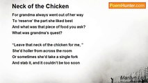 Oh how I love them chickens <br />Why, they make the world go ‘round <br />I’ve always enjoyed being near <br />The cluck cluck chicken sound <br /> <br />They’re industrious little creatures <br />Constantly busy scratchin’ the ground <br />Ah yes, and then once again you hear <br />That favorite clucking sound <br /> <br />You’ll never find a better friend <br />Than a chicken on the loose <br />He’s very happy to visit with you <br />Much more so than the silly goose <br /> <br />Did you ever sit in the chicken house <br />And just watch their busy day? <br />I have and although it’s stinky <br />They live in an interesting way <br /> <br />Out in the woods of a friend’s house <br />When I was just a little girl back when <br />Chickens roamed and laid their eggs <br />It was like Easter following those hens <br /> <br />We’d raise these furry creatures too <br />Starting from tiny chicks in a box <br />But once they went into the hen house <br />You had to watch for a cunning fox <br /> <br />Hate to mention the day that came along <br />When ma would lop off a few heads <br />YIKES it was an upsetting time for me <br />I’d rather have stayed right in my bed <br /> <br />But crispy home-fried chicken <br />Once the feather’s we’d finished pickin’ <br />Would make us forget all the rest <br />The best part of The World of Chicken!<br /><br />Marilyn Lott<br /><br />http://www.poemhunter.com/poem/the-world-of-chicken/