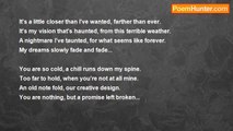 I walk a steady path <br />One without numbers or time <br />Yet I face the wrath <br />Of the wind blowing on my face <br /> <br />With scorpian stings and dusty wind <br />I walk a path where I never win <br />Maybe it's because I already have everything I've wanted <br /> <br />I've torn off my sleeves <br />A sign of my regret <br />I face this sunburnt winter <br />With the cold in my chest <br /> <br />I've reached the top and despite my eyes <br />I know in my heart I've never been better than this <br />Yet my mind runs dry and I have no idea why <br />but it's so hard for me to write this down <br /> <br />Inspiration seems like a thing of the past <br />Fading, but I know it will forever last <br />Love cannot be torn from a heart like mine <br />but it's my inspiration that I must find <br /> <br />I guess it all started when I wanted to write the perfect words for you <br />but the sad thing is all the best words have been taken <br />I wanted to write something new, something just for you <br />but I couldn't wait for my inspiration to awaken <br /> <br />I love you more with each beat of my bleeding heart <br />The thing is, this is only the start and you feel like home <br />Which is something I've never known but it feels so right <br />at night when I lay in my bed, only dreaming of you. <br /> <br />So while the words may not ignite your love <br />This is just a part of what I'm trying to say <br />The words couldn't fit but it goes somthing like this <br />I'll love you for as long as I exist.<br /><br />Moth Harris<br /><br />http://www.poemhunter.com/poem/you-re-inspiration/
