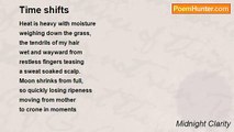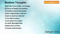 #1 <br /> <br />endless blue, <br />the colour of the sky, <br />your eyes, so close <br />our lashes tangle <br />in the blink <br />that ends the dream <br />my lips still <br />parted for your touch <br />a kiss forever <br />etched in thought <br />of passion that has <br />flared and still <br />lingers in the <br />dark damp halls <br />of memory, mind <br />open to the sky <br />and endless blue <br />the colour of <br />your eyes. <br /> <br /> <br />#2 <br /> <br />I drown in memories <br />of eyes so blue <br />they swallowed me <br />like sky eats clouds <br />and spits out <br />trailers <br />kite tails for the wind <br />to play with <br />play nice and do not bite <br />the gentle hand <br />that brings you love <br />in deep caresses <br />grasping at the heart <br />a thudding rhythm <br />at the center, red <br />as blood warm as <br />the sweat that <br />gathers at the corner <br />of the blue <br />to swell, to tremble, <br />fall, teardropp perfection <br />on my face, <br />salt to season love. <br /> <br /> <br />#3 <br /> <br />Blue light surrounds my soul <br />I breathe the air of cool <br />and blue <br />both me and you <br />combining in the surface <br />of your eyes reflection <br />of my own.The brown of <br />woodland pools with studs <br />of gold and green <br />collects the blue <br />and sends it back <br />perfumed with the rich <br />ripe scent of life <br />waiting to flare <br />across the skin <br />a fire to bathe in <br />burn in <br />to be born in <br />brown and blue. <br /> <br /> <br />#4 <br /> <br />Is it just your eyes <br />your mind, <br />that I inhabit? <br />Am I just a dream <br />once seen, graven <br />on the inside of your lids <br />taken out <br />on dark nights <br />enjoyed in stereo? <br />A voice imagined <br />in the shadows <br />while the mind plays tricks <br />with light and colour? <br />I sleep in dreams of blue <br />that comfort me <br />carry me from one morn <br />to the next and moons <br />wax and wane <br />unceasing in my slumber.<br /><br />Midnight Clarity<br /><br />http://www.poemhunter.com/poem/a-series-in-blue/