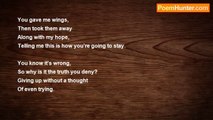 I want to feel the blade pushed deep. <br />I want my blood to run free. <br />I want to feel my soul fade. <br />I want my heart to melt away. <br /> <br />I want to float in the abyss. <br />I want blood on my wrists. <br />I want to float in my mind. <br />I want no pain until the end of time. <br /> <br />I want to abandon all thoughts <br />I want no more feelings to be fought. <br />I want to abandon all reason. <br />I want to be free of my life's prison.<br /><br />Heather Rhoden<br /><br />http://www.poemhunter.com/poem/freedom-117/