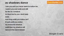my shadow followed you <br />today, <br />and found something <br />i wish it had not. <br />you have a <br />shadow not as lonely <br />as mine. <br />your shadow danced <br />with another. <br />my shadow... <br />is in the little <br />bit of warming wind you left <br />for me. <br />now that wind is turning <br />cold. <br />my shadow will still <br />follow behind you <br />untill you <br />truely notice, <br />its not just <br />another shadow. <br />... <br />my shadow still dances on.<br /><br />Morgan Evans<br /><br />http://www.poemhunter.com/poem/as-shadows-dance-part-2/