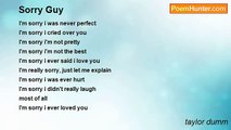 Oh I had a lot to say was thinking on my time away <br />I missed you and things weren't the same <br />Cause everything inside it never comes out right <br />And when I see you cry it makes me want to die <br />I'm sorry I'm bad, I'm sorry I'm blue, I'm sorry about all things I said to you <br />And I know I can't take it back <br />I love how you kiss, I love all you're sounds, and baby the way you make my world go round <br />And I just wanted to say I'm sorry: <br />This time I think I'm to blame it's harder to get through the days <br />You get older and blame turns to shame <br />[Pre-Chorus] <br />[Chorus] <br />Every single day I think about how we came all this way <br />The sleepless nights and the tears you cried it's never too late to make it right <br />Oh yeah sorry! <br />[Chorus] <br /> <br /> <br />(This song another by the artist buckcherry has some things i would love to say to my babe)<br /><br />taylor dumm<br /><br />http://www.poemhunter.com/poem/sorry-98/