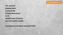 A crutch wedged in a thankful pit, <br />Close-gripped with a knurled fist <br />- Suspension bridge of pure grit - <br />Each reached plank, a pearled day. <br /> <br />Each early stride, a kept pledge <br />To un-scar an old, unkempt waddle, <br />Like forswearing the old booze bottle, <br />From near plank to far ledge. <br /> <br />Far below a thankless pride <br />Stokes dank and orange grudges, <br />Declining all crutches for gorges. <br />Thus it, with itself gorged, trudges. <br /> <br />The earthen lip of the far ledge beckons <br />To this wrecked boy. (Our days are few.) <br />“I'll use what I have, ” he reckons, <br />'Now and through my final seconds.” <br /> <br />[2-8-05 Santa Rosa, CA (revised 1-29-08 Livermore, CA) ]<br /><br />David Floren<br /><br />http://www.poemhunter.com/poem/pride-eschews-crutches/