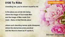 What is the subject of your poem? <br />‘I was there.’ <br /> <br />Why is it so important to you? <br />‘I was there.’ <br /> <br />How can you describe it? <br />‘I was there.’ <br /> <br />What did you know of it? <br />‘I was there.’ <br /> <br />And what did it teach you? <br />‘Of itself, nothing; <br />only that I was there.’ <br /> <br />And what will that bring to you? <br />‘Now, all may be known.’ <br /> <br />Then what can your poem share with others? <br />‘Be there too.’ <br /> <br />What can you say now <br />to those who thirst after knowledge? <br />‘Be here.’ <br /> <br />What can you say now <br />to those who thirst after God? <br />‘Be here.’ <br /> <br />And what of poetry and praise? <br />‘Always now.’ <br /> <br />And what of your soul? <br />‘Always here, and always now.’ <br /> <br />What then, the Creator’s message? <br />‘Be here; be now; be always.’ <br /> <br />And what the Creator’s smile of love? <br />‘The here; the now; the always.’<br /><br />Michael Shepherd<br /><br />http://www.poemhunter.com/poem/for-rilke-2/