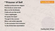 Once again the desires <br />From deep down the heart <br />As extension of the body <br />In dripping juices from the tip <br />Held down by the self control <br />The chains that the reason <br />Has put on to hold <br />Tied and wounded <br /> <br />Once again the flesh <br />Aching in expectancy <br />The unfulfilled dreams <br />Never shall it see <br />The days of the happy union <br />To break apart and come out naked <br />The covers of sublimations are too heavy <br /> <br />Dormant has gone the desire’s corner <br />The body now reacts but is quietus <br />Again the pain of yearning <br />Has become nothing <br />But a series of lamentations<br /><br />Sadiqullah Khan<br /><br />http://www.poemhunter.com/poem/self-control-8/