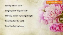 A resplendent stone twinkled. <br />But. <br />Man was dying. <br />In wars. <br /> <br />Turtles. <br />Still deposited their eggs into the sand. <br />But. <br />Earth was dying. <br /> <br />Bees. <br />Still found nectar in flowers. <br />But. <br />Bees were dying. <br /> <br />It was time. <br />To elect a new president. <br />In the soft <br />Colors. <br />Of <br />Dawn.<br /><br />M.L. Squier<br /><br />http://www.poemhunter.com/poem/in-memory-of-my-father-s-strong-hands/