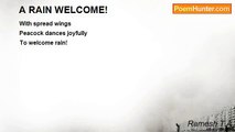 Rain lashed out with lighting and thunder for two days! <br />Then there was no rain but clouds were moving in the sky. <br />People going to the beach carried umbrellas with them; <br />After a day believing there won’t be rain went Scot-free! <br /> <br />Many groups of people regularly come and talk for hours <br />Making beach a pastime club rather than a walking place <br />And make disturbances to peace loving calm people there! <br />Nature played a game to teach them all a lesson forever! <br /> <br />After a walk I sat in my usual place for 10 minute rest there; <br />A group of people talking at high pitch were without umbrellas; <br />A slight drizzle provoked them to get up and hurry for home; <br />Then the falling dropp of rain stopped and I started home. <br /> <br />But seeing no heavy rain other groups again started talking <br />When I reached the other end again rain started to fall…. <br />All the groups rushed out to home without anyone sitting there; <br />Again the rain stopped and I had a small snack before return! <br /> <br />After a 5 minute halt I started walking home without umbrella; <br />Everywhere the roads and pavements were clean due to rain; <br />Everything looked clean and orderly without govt. cleaning daily! <br />When I just entered my home heavy rain fell down like hell long!<br /><br />Ramesh T A<br /><br />http://www.poemhunter.com/poem/a-play-of-rain/