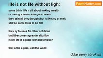 When u are not here, <br />to share my day and night <br />my life is incomplete <br />for you are my heart and soul; <br />the oneness i had seek <br />without you <br />i merely exist from day to day <br />with you <br />i know that i will find <br />all that i have been searching for <br /> <br />my completeness, my eternal peace of mind <br />you are the keeper of my dreams <br />the woman who holds my heart in her hands <br />the one i want to spend my life with <br />the i one whom i will always stand beside <br />through thick and thin <br />through all that life throws our way <br />knowing that this special love <br />we share will guide us each and everyday <br /> <br />this is the journey we started long ago <br />before this time and place <br />the journey of completeness <br />as two heart and soul embraces <br />forever i want with you <br />for the search is at end <br />our heart have found each other <br />as lovers, as soul mates, as friends<br /><br />duke perry abrokwa<br /><br />http://www.poemhunter.com/poem/kyridel/
