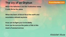 Sometimes when I’m alone <br />I cry because I’m lonely and on my own <br />The tears I cry are bitter and warm <br />They flow with life but take no form of it <br />I cry because my heart is torn <br />And I find it difficult to carry on <br /> <br />If I had an ear to confide in <br />I would cry among my treasured friends <br />But who do you know that stops along the way to help another carry on <br /> <br />The world moves fast and it would pass you like you’re invisible <br />And it won’t halt to see what makes you cry so hard <br />It’s painful and sad, that’s why I cry <br /> <br />Sometimes I cry <br /> <br />And no-one cares why.<br /><br />Farhana Abdullah<br /><br />http://www.poemhunter.com/poem/sometime-i-cry/
