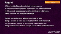 I am sorry for all the times I have failed you, <br />not being there to console and comfort you, <br />when ever I could of made a difference, but didn't. <br />For every chance I might have had to free you from pain. <br /> <br />To liberate your soul from all that torture around, <br />to show you the love which might not have been there at times, <br />as you couldn't come to me, but I could've come to you. <br />At times which you spent all night crying without someone to talk to. <br /> <br />Which I could of been there to hold you in my arms, <br />to support you through these harsh times and disappointments, <br />rocking you to sleep as your worries turn into sweet dreams. <br />Being your one and only guardian angel. <br /> <br />But yet I am so far away, without being able to help, <br />being a coward to come out of my shell which protects myself, <br />not being brave enough to run through the mines for you, <br />being useless when there is enough space in here for the two of us. <br /> <br />And still I sit here and watch you out there all alone, <br />terrorized by the present and cowering about the future, <br />as I watch wishing to switch places with you, now, <br />wanting for you to be safe and me in pain, as I can't stand this anymore. <br /> <br />As I regret everything I haven't done since I met you, <br />everything which would have made your life easier, <br />all which would have maybe put you in this shell here by my side, <br />anything I could of done to show you how much I really care.<br /><br />Javier Falcon<br /><br />http://www.poemhunter.com/poem/regret-67/
