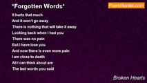 I forgotten memory <br />You left me <br />Broken on the ground <br />Now I am crying out <br />Laying here <br />Shattered and bloody <br />Yet you do nothing <br />But walk out of the door <br />Leaving me here <br />To take care of myself <br />To never reaper <br />You shattered my heart <br />Upon this floor <br />Never to restart the love <br />We once shared <br />Now all I am is lost <br />Just a lost soul <br />That has no where to go <br />All that I can do <br />Is sit here <br />All alone <br />And cry <br />Yet you don’t know <br />How far I would go <br />To save you <br />But to you <br />I am just a pretty girl <br />That has a flawless smile <br />But really all I want <br />Is to die <br />Never do I want to cry <br />But it is all I can do <br />Now that I have lost you <br />I am tired of fighting <br />I am already dying <br />There is nothing <br />More I can do <br />I want to show you <br />How much I really love you <br />But you will never know <br />How I just can’t let go <br />Did you ever care? <br />Or were you just <br />Fucking with my mind <br />Like every other guy <br />Never will I mind <br />If I waste my time <br />With you <br />The one who <br />Is my true love <br />I want to waste my time <br />With you <br />I am tired <br />Of being alone <br />I might as well <br />Just let everything go <br />Take my own life <br />On this lonely night <br />All I need is a knife <br />So I guess this is my goodbye<br /><br />Broken Hearts<br /><br />http://www.poemhunter.com/poem/forgotten-72/
