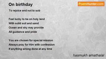 What shall happen? <br />Not thought over even <br />Many happiness lies in store <br />Birthday brings it on the fore <br /> <br />Fortune has to smile <br />One has to go ahead meanwhile <br />Happiness to self and for others <br />Responsibility to share and shoulder <br /> <br />If we take birthday as good sign <br />We must realize the facts and resign <br />It brings great sign of challenges <br />Demands great ability to sustain and manage <br /> <br />What can happen if you fail? <br />What can be takes as life to avail? <br />Merely passing of years as wastage <br />Not to take into account about age <br /> <br />Yet celebrate it with fun fare <br />As one day you may take steps and dare <br />You may think to go ahead and jump into fray <br />Make the headway with clean sweep and find the way <br /> <br />This is what mankind must thrive for <br />Engage self in worthwhile in tactics or <br />Stay still in touch with emerging scenes <br />Show the courage on field previously never seen <br /> <br />Nothing can happen if proper taken care is taken <br />Faith should remain firm and not shaken <br />Everything comes from right stubborn approach <br />The birthdays may prove decisive if thought as such<br /><br />hasmukh amathalal<br /><br />http://www.poemhunter.com/poem/birthdays-ahead/