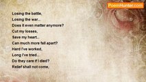 I close my eyes <br />And there he is <br />Just waiting to tear me down. <br />Each time I fight back <br />Knowing I will be beaten <br />He knows my every weakness. <br />I've learned not to run, <br />He will catch me. <br />I've learned not to hide, <br />He will find me. <br />I have no sancuary from the One, <br />The One inside my head...<br /><br />Jason Daniels<br /><br />http://www.poemhunter.com/poem/the-one-inside-3/