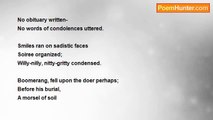 Atmosphere above and around <br />Failed to befriend him; <br />So the meteorites stroke his fate. <br /> <br />Flimsy wall of his sordid hut <br />Eased him see around from the bed; <br />So he read his life-each side. <br /> <br />His thatched roof as old as he <br />Foundered combating summer shower <br />So ample nights he spent along pool. <br /> <br /> Yet he smiles. <br /> <br />His Earth-limited to standing his hut <br />Witnessing his interminable misery- <br />Witnessed his parents' demise, <br />Witnessed his other-half's demise <br />Witnessed his only kid's demise. <br />Appreciates his interior might. <br /> <br />Many go his hands and mouth made <br />To draw wine-kill his inner fire; <br />His mind duly denied. <br /> <br />His hands often touched suicide rope <br />Eyes located apt sites for valediction; <br />His mind earnestly denied. <br /> <br />His legs attempted for many times <br />Vacating the hut for anonymous best; <br />Reminiscence stood- paralyzed him. <br /> <br /> Yet he smirks. <br /> <br />He happily cried on seeing <br />Naked flora of late winter <br />Casually anticipating Spring.<br /><br />RUP POKHAREL<br /><br />http://www.poemhunter.com/poem/defeating-double-bind/