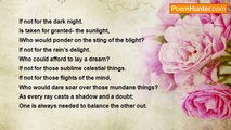 Nature dazzles the bewitched eye, <br />With splashing colours of a rainbow -on fire in the copper sky, <br />With cascading waterfall- flirts a roving butterfly, <br />With shooting stars banished-to light up the Milky Way, <br />With a hovering humming bird that belittles the peacock dancing in the rain, <br />With glowing fire-flies—on their backs hold torch to a visionary dream. <br /> <br />Nature disperses the incense of fragrances, <br />Of a damasked rose-held together by reckless thorns, <br />Of coy jasmines-blooming only in the twilight of false dawn, <br />Of sandalwood limbs-where lie twined the vilest snakes, <br />Of earthy smells-wrought of dry earth in summer rain, <br />Of spring flavors—ripped, ooze out in their best form, when treaded upon. <br /> <br />Nature plays tenors to the patient ear on tinsel wings, <br />In birds calls-mountains echo in the wee hours of the morning, <br />In a shepherd’s song—thaws to tears the simmering heat, <br />In whispering trees—shedding leaves in the stillness of the forest, <br />In pounding waves –shores sing their victory over lost distances, <br />In pattering rain — from heaven’s lowered eye-lids the foliage bears the bruises. <br /> <br />Nature’s largesse—offerings to a savoring tongue, <br />The ripest fruit—harbors the loathsome slithering worm, <br />The sweetest grape—wrought from the most twisted tortured vines, <br />The Honey sweet nectar—stolen from ten thousand flower's confines, <br />The morning dew—lands with a stony thud onto the blossoms still beating breast, <br />The berries bountiful of prime spring – clothe nature in her wedding dress. <br /> <br /> Nature is the hand of God ruffling earth, sometimes in mirth; <br />With the passing of this entire birth, in my arms I could measure it’s girth, <br />Still miss—and turn my living soul to stone; <br />To be reborn with my heightened vision of his melancholy art, <br />He did put love in my heart! <br /> <br />x-x-x <br />Seema.Joglekar <br />5th Dec-2009<br /><br />Seema joglekar<br /><br />http://www.poemhunter.com/poem/why-love-6/