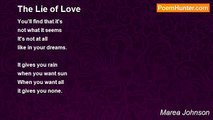 Summer rain <br />gently falling <br />on shoulders <br />unable to carry <br />the burdens you create <br />as you explain <br />why you can't love me. <br /> <br />Sky turns from orange <br />to pink <br />to red <br />to purple <br />reminding me <br />of the gifts you left <br />on my face. <br /> <br />The summer rain <br />begins to stop <br />leaving in its wake <br />a rainbow of colors <br />we don't deserve to see. <br /> <br />Won't bother <br />to look for a pot <br />at the end of it <br />for none exists <br />anymore than the love <br />I thought we had. <br /> <br />The summer rain <br />dries quickly <br />on the dirt road <br />you drive away on <br />leaving me <br />in your dust.<br /><br />Marea Johnson<br /><br />http://www.poemhunter.com/poem/summer-rain-19/