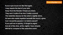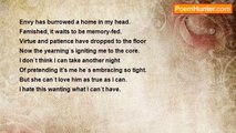 Slink, you black devil <br />Across my room. <br />Into my face, unsubtle. <br />I`m not afraid of you. <br />See, I only fear <br />What befalls unknown, <br />Not this intimacy here <br />Where empathy has grown. <br />You`ve sheilded me <br />From my reckless hell <br />When I couldn`t stand to see <br />How very far I fell. <br />Within your fiery embrace <br />I find absolution <br />And the means to face <br />Truth born of confusion <br />You stealthily entice <br />With a shiny new blade <br />Your ending advice <br />Of a tranquil persuade <br />Stripped down by a measure <br />of incomparable ease <br />I cling to what pleasure <br />Flows from the devil beside me<br /><br />Brandi Guthrie<br /><br />http://www.poemhunter.com/poem/devil-beside-me/