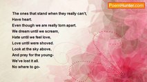 I see those pretty things, <br />And they walk right pass me. <br />I see the beautiful things, <br />And that's all she is. <br /> <br />Pretty things wipe away the make up, <br />After the unforgettable break up. <br />The beautiful things hide the pain, <br />As she walks away in shame. <br /> <br />When I first heard your voice, <br />I felt so alive, that I could just die. <br />I want to fall into your arms <br />And be warm like the sun <br /> <br />I see those pretty things, <br />And they walk right pass me. <br />I see the beautiful things, <br />And that's all she is.<br /><br />Grant Lovell<br /><br />http://www.poemhunter.com/poem/those-pretty-things/