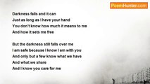 I'm hidden in the night <br />Waiting for a time <br />A time to come out <br />And let my light shine <br />Not during a crime <br />Nor during a fight <br />But sometime <br /> <br />Sometime when I'm need to most <br />During someone's darkest hour <br />Someone who has drift <br />Someone who has grown sour <br />That'st why I stand <br />As an angel in the darkness<br /><br />Shelby Smith<br /><br />http://www.poemhunter.com/poem/angel-in-the-darkness-2/
