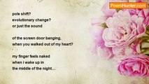 that book on the shelf, <br />the one you've forgotten, <br />waiting in silence, <br />untouched and unread. <br />the crack in the window, <br />rainwater seeps through. <br />the lamp by the table, <br />you never turn on. <br />the axe in the corner, <br />covered by shadows and web. <br />the limbs ripped from the tree, <br />blown by the storm. <br />that old photograph album, <br />pictures yellowed by time. <br />the guitar in the closet, <br />waiting to be strung. <br />and the sound of the ocean, <br />in the shell you never pick up. <br />the skin left by the snake, <br />clouds that cover the moon. <br />the letter you never opened, <br />the ring in the drawer... <br />my heart on the pillow, <br />you never sleep on!<br /><br />Eric Cockrell<br /><br />http://www.poemhunter.com/poem/you-never-sleep-on/