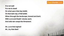 Dull, dimly gleaming, <br />The dawn looks downward <br />Where, flowing townward, <br />The river, steaming <br />With mist, is hidden: <br />Each bush, that huddles <br />Beside the road, the rain has pooled with puddles, <br />Seems, in the fog, a hag or thing hag-ridden. <br /> <br />II. <br /> <br />Where leaves hang tattered <br />In forest tangles, <br />And woodway angles <br />Are acorn-scattered, <br />Coughing and yawning <br />The woodsman slouches, <br />Or stands as silent as the hound that crouches <br />Beside him, ghostly in the mist-drenched dawning. <br /> <br />III. <br /> <br />Through roses, rotting <br />Within the garden, <br />With blooms, that harden, <br />Of marigolds, knotting, <br />(Each one an ember <br />Dull, dead and dripping,) <br />Her brow, from which their faded wreath is slipping, <br />Mantled in frost and fog, comes in November.<br /><br />Madison Julius Cawein<br /><br />http://www.poemhunter.com/poem/gray-november/