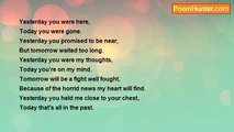 Yesterday’s gone <br />But you have to go on <br />You can’t live like a moron <br />Thinking about yesterday’s dawn. <br /> <br />Today’s on <br />Live it full on <br />Like a mellow song <br />Switch your mood on. <br /> <br />Tomorrow’s coming on <br />And your time is on <br />Make everyone deem on <br />That you are born <br />To live on and on.<br /><br />Prachi Agrawal<br /><br />http://www.poemhunter.com/poem/yesterday-today-tomorrow-11/