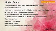 Scars are every where <br />Your face <br />Your arms <br />Your heart <br />Your brian <br />Some are emotional <br />Some are physical <br />Some are unforgetabel <br />Be careful where you put scars <br />Some are perminate <br />Some fade <br />But scars are scars<br /><br />Haley Fisher<br /><br />http://www.poemhunter.com/poem/scars-156/