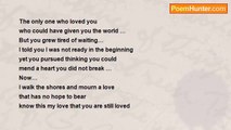The only one who loved you <br /> who could have given you the world … <br />But you grew tired of waiting… <br /> I told you I was not ready in the beginning <br />Yet you pursued thinking you could <br />mend a heart you did not break … <br />Now… <br />I walk the shores and mourn a love <br />that has no hope to bear <br />Know this my love that you are still loved <br />and will be thought of out there <br />Where the world is still turning where changes make a day <br />where there’s sand beneath my feet and the setting of the sun <br />Sadly enough you were the only one <br />that came close enough to my heart<br /><br />joy lemoine Powell<br /><br />http://www.poemhunter.com/poem/you-will-never-forget/
