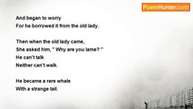 There was a whale, <br />A rare whale <br />Who had bare feet. <br /> <br />He was happy with his tool kit. <br />But suddenly the tool kit lit <br />And when the tool kit ignite <br />He said, '' My tool kit was burned at the right.'' <br /> <br />He felt sorry <br />And began to worry <br />For he borrowed it from the old lady. <br /> <br />Then when the old lady came, <br />She asked him, '' Why are you lame? '' <br />He can't talk <br />Neither can't walk. <br /> <br />He became a rare whale <br />With a strange tail.<br /><br />Shepherd Reyna<br /><br />http://www.poemhunter.com/poem/the-lonely-whale/