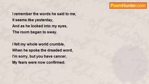 I thought I saw an Angel, as I lay in my bed, <br />I felt so low, as worried thoughts, came to my weary head. <br />I sensed someone was present, I opened my tired eyes, <br />And there she sat above me, I looked up with surprise! <br /> <br />Angels can appear, in any shape and form, <br />This girl looked down, with impish smile, I felt to calm and walm. <br />Was this a message from above, a reassuring sign? <br />I think I found my answer, when the Doctor said, Your Fine!<br /><br />Jayne Davies<br /><br />http://www.poemhunter.com/poem/my-angel-242/