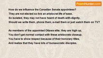 If the government has the power but do it; do they have the guts? <br />They want to tinker with the appointed Senate; no ifs, no ands, no buts, <br />Term limits might help or even Senate elections, <br />But Quebec government is annoyed about these selections. <br /> <br />Apparently it’s unconstitutional so please stop, <br />While only appointed aristocrats want to decide on the lot, <br />So seven provinces and half the people need to be in too, <br />So please no more aristocrat appointees lined up in a queue. <br /> <br />And our appointed Supreme Court wants in on this; from up high, <br />The same crowd that denied Sue Rodriguez permission to die, <br />Our senators didn’t have to work on a Friday till now, <br />The whole place is upset because of this ongoing row.<br /><br />James Bredin<br /><br />http://www.poemhunter.com/poem/gutless-senate/