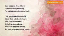 I see in the mirror of futurity <br />Our souls shining in the sky <br />Being two lovely stars <br />Emitting the rays of Love <br />Year after year <br />And showing the way <br />To the true lovers of future <br />Without being touched <br />With the sharp edge <br />Of the scythe of Time <br />As now our hearts <br />Are unseparated from each other <br />And bound with the light of <br />The unification of Love - <br />More valuable than anything else <br />In the Universe. <br /> <br />By Dipankar Sadhukhan <br />Kolkata, India. <br />Copyrights@December27,2013.<br /><br />Dipankar Sadhukhan<br /><br />http://www.poemhunter.com/poem/unification-of-love/