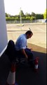 Assis sur une chaise de bureau, un homme tente de se propulser avec un extincteur à chaque main. Après un premier essai non concluant, il parvient néanmoins à parcourir quelques mètres lors d'une seconde tentative, mais finit tout de même par chuter, dispersant du gaz carbonique partout autour de lui.