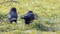 A female crow asks her mate for some of his food.