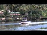 View of Motor boat sailing down the backwaters of Kerala, India. One can also see the coconut plantations on the shores of backwaters.<br /><br />The Kerala backwaters are a chain of brackish lagoons and lakes lying parallel to the Arabian Sea coast (known as the Malabar Coast) of Kerala state in southern India. The network includes five large lakes linked by canals, both man made and natural, fed by 38 rivers, and extending virtually half the length of Kerala state. The backwaters were formed by the action of waves and shore currents creating low barrier islands across the mouths of the many rivers flowing down from the Western Ghats range.<br /><br />The Kerala Backwaters are a network of interconnected canals, rivers, lakes and inlets, a labyrinthine system formed by more than 900 km of waterways, and sometimes compared to the American Bayou. In the midst of this landscape there are a number of towns and cities, which serve as the starting and end points of backwater cruises. National Waterway No. 3 from Kollam to Kottapuram, covers a distance of 205 km and runs almost parallel to the coast line of southern Kerala facilitating both cargo movement and backwater tourism.<br /><br />The backwaters have a unique ecosystem - freshwater from the rivers meets the seawater from the Arabian Sea. In certain areas, such as the Vembanad Kayal, where a barrage has been built near Kumarakom, salt water from the sea is prevented from entering the deep inside, keeping the fresh water intact. Such fresh water is extensively used for irrigation purposes.<br /><br />Many unique species of aquatic life including crabs, frogs and mudskippers, water birds such as terns, kingfishers, darters and cormorants, and animals such as otters and turtles live in and alongside the backwaters. Palm trees, pandanus shrubs, various leafy plants and bushes grow alongside the backwaters, providing a green hue to the surrounding landscape.<br /><br />Vembanad Kayal is the largest of the lakes, covering an area of 200 km², and bordered by Alappuzha (Alleppey), Kottayam, and Ernakulam districts. The port of Kochi (Cochin) is located at the lake's outlet to the Arabian Sea. Alleppey, "Venice of the East", has a large network of canals that meander through the town. Vembanad is India's longest lake.<br /><br />Source :- Wikipedia<br /><br />This footage is part of the professionally-shot broadcast stock footage archive of Wilderness Films India Ltd., the largest collection of HD imagery from South Asia. The Wilderness Films India collection comprises of 50, 000+ hours of high quality broadcast imagery, mostly shot on HDCAM / SR 1080i High Definition, Alexa, SR, HDV and XDCAM. Write to us for licensing this footage on a broadcast format, for use in your production! We are happy to be commissioned to film for you or else provide you with broadcast crewing and production solutions across South Asia. We pride ourselves in bringing the best of India and South Asia to the world... <br /><br />Please subscribe to our channel wildfilmsindia on Youtube for a steady stream of videos from across India. Also, visit and enjoy your journey across India at www.clipahoy.com , India's first video-based social networking experience!<br /><br />Reach us at rupindang @ gmail . com and admin@wildfilmsindia.com