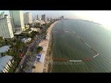 Aerial view of Pattaya beaches and high rise buildings of Pattaya city in Thailand.<br /><br />Pattaya is a city in Thailand, a beach resort popular with tourists and expatriates. It is located on the east coast of the Gulf of Thailand, about 100 kilometres (62 mi) southeast of Bangkok within but not part of Amphoe Bang Lamung (Banglamung) in the province of Chonburi.<br /><br />Pattaya City is a self-governing municipal area which covers the whole tambon Nong Prue and Na Kluea and parts of Huai Yai and Nong Pla Lai. The City is situated in the heavily industrial Eastern Seaboard zone, along with Si Racha, Laem Chabang, and Chonburi. It has a population exceeding 100,000 (2007). Pattaya is also the center of the Pattaya-Chonburi Metropolitan Area, the conurbation in Chonburi Province, with a total population exceeding 1,000,000.<br /><br />The main sweep of the bay area is divided into two principal beachfronts. Pattaya Beach is parallel to city centre, and runs from Pattaya Nuea south to Walking Street. Along Beach Road are restaurants, shopping areas, and night attractions.<br />Jomtien Beach in the southern part of the bay area is divided from Pattaya beach by the promontory of Pratamnak Hill. It consists of high-rise condominiums, beachside hotels, bungalow complexes, shops, bars, and restaurants. On weekends, it becomes increasingly crowded, with many Thai visitors coming from Bangkok. It offers of watersport activities such as jet skis, parasailing and small sail boat hire. The Pratumnak Hill area is gaining in popularity for its beach as it is a quieter area and it has a lot of new hotel and condominium resorts in development around the area reflecting on growing demand.<br /><br />Offshore islands include the "Near Islands", Ko Larn (main island), Ko Sak and Ko Krok located 7 kilometres (4.3 mi) from the western shores of Pattaya Ko Larn, or "Coral Island", Mu Ko Phai, the "Far Islands", Ko Phai (main island), Ko Man Wichai, Ko Hu Chang and Ko Klung Badan, located offshore further west of the "Near Islands", and Ko Rin, located offshore to the southwest, south of Mu Ko Phai. Some of the islands in the group are accessible by speedboat in less than 15 minutes and by ferry taking about 45 minutes. The names "Near Islands", "Far Islands" and "Coral Island" are used for touristic purposes only and do not correspond to any naming conventions of the island groups and are not shown on maritime charts published by the Hydrographic Service of the Royal Thai Navy. Many of the islands have public beaches and offer scuba diving activities.<br /><br />Source : Wikipedia<br /><br />This footage is part of the professionally-shot broadcast stock footage archive of Wilderness Films India Ltd., the largest collection of HD imagery from South Asia. The Wilderness Films India collection comprises of 50, 000+ hours of high quality broadcast imagery, mostly shot on HDCAM / SR 1080i High Definition, Alexa, SR, HDV and XDCAM. Write to us for licensing this footage on a broadcast format, for use in your production! We are happy to be commissioned to film for you or else provide you with broadcast crewing and production solutions across South Asia. We pride ourselves in bringing the best of India and South Asia to the world... <br /><br />Please subscribe to our channel wildfilmsindia on Youtube for a steady stream of videos from across India. Also, visit and enjoy your journey across India at www.clipahoy.com , India's first video-based social networking experience!<br /><br />Reach us at rupindang @ gmail . com and admin@wildfilmsindia.com
