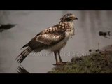 A lone Crested Hawk Eagle sits by Ken River and drinks water from it in Panna National Park, Madhya Pradesh, India.<br /><br />The Changeable Hawk-Eagle or Crested Hawk-Eagle (Nisaetus cirrhatus) is a bird of prey species of the family Accipitridae. It was formerly placed in the genus Spizaetus, but studies pointed to the group being paraphyletic resulting in the Old World members being placed in Nisaetus (Hodgson, 1836) and separated from the New World species.<br /><br />Changeable Hawk-Eagles breed in the Indian Subcontinent, mainly in India and Sri Lanka, and from the southeast rim of the Himalaya across Southeast Asia to Indonesia and the Philippines. This is a bird occurring singly (outside mating season) in open woodland, although island forms prefer a higher tree density. It builds a stick nest in a tree and lays a single egg.<br /><br />The Changeable Hawk-Eagle is a medium-large raptor at about 60--72 centimetres (24--28 in) in length with a 127--138 centimetres (50--54 in) wingspan, and a weight ranging from 1.2 to 1.9 kg. It is a relatively slender forest eagle with some subspecies (especially limnaetus) being dimorphic giving the name of "Changeable". This, and also a complicated phylogeny further complicates precise identification.<br /><br />Normally brown above; white below with barring on the undersides of the flight feathers and tail; black longitudinal streaks on throat and chocolate streaks on breast. Some subspecies have a crest of four feathers, but this is all but absent in others. The sexes are quite similar in their plumage, but males are about 15% smaller than females. The underparts and head of juveniles are whitish or buff with few dark streaks.<br /><br />The wings are long and parallel-sided, and are held flat in flight, which helps to distinguish this species from the similar Mountain Hawk-Eagle. In overhead flight, comparatively rounded wings (upturned at tip), longish tail, white body (spotted with brown) and grey underside of wings (streaked and spotted) are leading pointers. Call is a loud, high-pitched ki-ki-ki-ki-ki-ki-ki-ki-kee, beginning short, rising in crescendo and ending in a scream.<br /><br />Source : WIkipedia<br /><br />This footage is part of the professionally-shot broadcast stock footage archive of Wilderness Films India Ltd., the largest collection of HD imagery from South Asia. The Wilderness Films India collection comprises of 50, 000+ hours of high quality broadcast imagery, mostly shot on HDCAM / SR 1080i High Definition, Alexa, SR, HDV and XDCAM. Write to us for licensing this footage on a broadcast format, for use in your production! We are happy to be commissioned to film for you or else provide you with broadcast crewing and production solutions across South Asia. We pride ourselves in bringing the best of India and South Asia to the world... <br /><br />Please subscribe to our channel wildfilmsindia on Youtube for a steady stream of videos from across India. Also, visit and enjoy your journey across India at www.clipahoy.com , India's first video-based social networking experience!<br /><br />Reach us at rupindang @ gmail . com and admin@wildfilmsindia.com