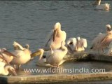 The great white pelican (Pelecanus onocrotalus) also known as the eastern white pelican, rosy pelican or white pelican is a bird in the pelican family. It breeds from southeastern Europe through Asia and in Africa in swamps and shallow lakes.<br /><br />The great white pelican is a huge bird, with only the Dalmatian pelican averaging larger amongst the pelicans. The wingspan can range from 226 to 360 cm (7.41 to 11.81 ft), with the latter measurement the largest recorded among extant flying animals outside of the great albatrosses. The total length of the great white pelican can range from 140 to 180 cm (55 to 71 in), with the enormous bill comprising 28.9 to 47.1 cm (11.4 to 18.5 in) of that length. Adult males, weigh from 9 to 15 kg (20 to 33 lb), though large races from the Palaearctic are usually around 11 kg (24 lb) with few exceeding 13 kg (29 lb). Females are considerably less bulky and heavy, weighing from 5.4 to 9 kg (12 to 20 lb). Among standard measurements, the wing chord length is 60 to 73 cm (24 to 29 in), the tail is 16 to 21 cm (6.3 to 8.3 in) and the tarsus is 13 to 14.9 cm (5.1 to 5.9 in). The standard measurements from differing areas indicate that pelicans of the species from the Western Palaearctic are somewhat larger in size than ones that reside in Asia and in Africa.<br /><br />Immature great white pelicans are grey and have dark flight feathers. In flight, it is an elegant soaring bird, with the head held close to and aligned with the body by a downward bend in the neck. In breeding condition the male has pinkish skin on its face and the female has orangey skin.[8] It differs from the Dalmatian pelican by its pure white, rather than greyish-white, plumage, a bare pink facial patch around the eye and pinkish legs. Males are larger than females, and have a long beak that grows in a downwards arc, as opposed to the shorter, straighter beak of the female. The spot-billed pelican of Asia is slightly smaller than the great white, with clear brownish-grey plumage and a paler, duller-colored bill. Similarly, the pink-backed pelican is smaller with brownish-grey plumage, with a light pink to off-grey bill and a pinkish wash to the back.<br /><br />The great white pelican is well adapted for aquatic life. The short strong legs and webbed feet propel it in water and aid the rather awkward takeoff from the water surface. Once aloft, the long-winged pelicans are powerful fliers, however, and often travel in spectacular V-formation groups.<br /><br />Source : Wikipedia<br /><br />This footage is part of the professionally-shot broadcast stock footage archive of Wilderness Films India Ltd., the largest collection of HD imagery from South Asia. The Wilderness Films India collection comprises of tens of thousands of hours of high quality broadcast imagery, mostly shot on HDCAM / SR 1080i High Definition, Alexa, SR, HDV and XDCAM. Write to us for licensing this footage on a broadcast format, for use in your production! We are happy to be commissioned to film for you or else provide you with broadcast crewing and production solutions across South Asia. We pride ourselves in bringing the best of India and South Asia to the world... Reach us at rupindang @ gmail . com and admin@wildfilmsindia.com.