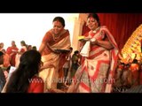 Devotees praying to Goddess Durga on this auspicious occasion of Durga festival that represents the victory of Goddess Durga over the evil Mahishasura.<br /><br />Durga Puja also referred to as Durgotsava or Sharadotsav is an annual Hindu festival in South Asia that celebrates worship of the Hindu goddess Durga. It refers to all the six days observed as Mahalaya, Shashthi, Maha Saptami, Maha Ashtami, Maha Navami and Vijayadashami. The dates of Durga Puja celebrations are set according to the traditional Hindu calendar and the fortnight corresponding to the festival is called Devi Paksha, 'Fortnight of the Goddess'). Devi Paksha is preceded by Mahalaya, the last day of the previous fortnight Pitri Paksha, 'Fortnight of the Forefathers'), and is ended on Kojagori Lokkhi Puja ('Worship of Goddess Lakshmi on Kojagori Full Moon Night').<br /><br />Durga Puja festival marks the victory of Goddess Durga over the evil buffalo demon Mahishasura. Thus, Durga Puja festival epitomises the victory of Good over Evil.<br /><br />Durga Puja is widely celebrated in the Indian states of Assam, Bihar, Jharkhand, Manipur, Odisha, Tripura and West Bengal, where it is a five-day annual holiday. In West Bengal and Tripura, which has a majority of Bengali Hindus, it is the biggest festival of the year. Not only is it the biggest Hindu festival celebrated throughout the state, it is also the most significant socio-cultural event in Bengali Hindu society.<br /><br />The prominence of Durga Puja increased gradually during the British Raj in Bengal. After the Hindu reformists identified Durga with India, she became an icon for the Indian independence movement. In the first quarter of the 20th century, the tradition of Baroyari or Community Puja was popularised due to this. After independence, Durga Puja became one of the largest celebrated festivals in the whole world.<br /><br />Durga Puja also includes the worship of Shiva, who is Durga's consort (Durga is an aspect of Goddess Parvati), in addition to Lakshmi, Saraswati with Ganesha and Kartikeya, who are considered to be Durga's children. Worship of mother nature is done, through nine types of plant (called "Kala Bou"), including a plantain (banana) tree, which represent nine divine forms of Goddess Durga. Modern traditions have come to include the display of decorated pandals and artistically depicted idols (murti) of Durga, exchange of Vijaya greetings and publication of Puja Annuals.<br /><br />source - Wikipedia<br /><br />This footage is part of the professionally-shot broadcast stock footage archive of Wilderness Films India Ltd., the largest collection of HD imagery from South Asia. The Wilderness Films India collection comprises of tens of thousands of hours of high quality broadcast imagery, mostly shot on HDCAM / SR 1080i High Definition, Alexa, SR, HDV and XDCAM. Write to us for licensing this footage on a broadcast format, for use in your production! We are happy to be commissioned to film for you or else provide you with broadcast crewing and production solutions across South Asia. We pride ourselves in bringing the best of India and South Asia to the world... Reach us at rupindang @ gmail . com and admin@wildfilmsindia.com.