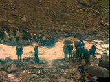 Framed through Himalayan Birch (Betula utilis) or bhoj patra trees, a group of high altitude porters descend a cliff in the Nanda Devi Sanctuary to the Rishi Ganga gorge camp.<br /><br />Nanda Devi National Parks & Wildlife Sanctuaries:<br /><br />Nanda Devi National Park is an outstanding mountain wilderness with few if any parallels elsewhere in the Himalayas on account of its concentration of high peaks and glaciers lying within a range of near -- pristine habitats. It lies within a bio geographical transition zone between the Western and Eastern Himalayas and supports a variety of threatened and uncommon species of large mammals. Nanda Devi National Park is situated in Chamoli district of Uttarakhand. The spectacular panoramas of peaks encircling the National Park are Trishul (7120 m) Dunagiri (7066 m) Nanda Devi (7817 m) Nanda Devi East (7430 m) Bethartoli (6352 m) etc.<br /><br />The beautiful surroundings with abundant flora and fauna like Brahma-Kamal and Bharal (blue mountain goat) make this a sanctuary of nature. The area is reputed as one of the most spectacular wilderness in the Himalaya and is dominated by "Nanda Devi Peak" which is a natural monument and India's second highest peak. The Nanda Devi National Park the world heritage site has unique topography, climate, and soil and it supports diverse habitat, species, communities and ecosystems. The beautiful surroundings with abundant flora and fauna like Brahma-Kamal and Bharal (blue mountain goat) make this a sanctuary of nature. <br /><br />In 1982 access to trekkers into the Nanda Devi National Park was banned to protect its biodiversity. The Nanda Devi National Park, which has been declared a world heritage site, has been partially opened recently for restricted number of tourist. The Nanda Devi basin was declared as Nanda Devi Sanctuary in 1939. An area of 630 sq. Km. was added as Nanda Devi National Park in the year 1982 which is now a part and core zone of Nanda Devi Biosphere Reserve.The Park became a world heritage site in the year 1988. <br /><br />The Nanda Devi Sanctuary can be divided into two parts, Inner and Outer. Together, they are surrounded by the main Sanctuary Wall, which forms a roughly square outline, with high, continuous ridges on the north, east, and south sides. On the west side, less high but still imposing ridges drop from the north and south toward the Rishi Ganga Gorge, which drains the Sanctuary towards the west. The Inner Sanctuary occupies roughly the eastern two-thirds of the total area, and contains Nanda Devi itself and the two major glaciers flanking the peak, the Uttari (north) Rishi Glacier and the Dakshni (south) Rishi Glacier. These are fed by the smaller Uttari Nanda Devi and Dakshni Nanda Devi Glaciers respectively. The first recorded entry of humans into the Inner Sanctuary was by Eric Shipton and H. W. Tilman in 1934, via the Rishi Gorge.<br /><br />The Outer Sanctuary occupies the western third of the total Sanctuary, and is separated from the Inner Sanctuary by high ridges, through which flows the Rishi Ganga. It is split in two by the Rishi Ganga; on the north side lies the Ramani Glacier, flowing down from the slopes of Dunagiri and Changabang, and on the south lies the Trisul Glacier, flowing from the peak of the same name. This portion of the Sanctuary is accessible to the outside (though requiring the crossing of a 4,000 m (13,000 ft) pass). The first serious climbing expedition to pass through the Outer Sanctuary was that of T. G. Longstaff, who climbed Trisul I in 1907 via the eponymous glacier.<br /><br />Some of the important peaks encircling the Nanda Devi National Park are Dunagiri, Changband, Kalnka, Rishi pahar, Mangraon, Nanda Khat, Maiktoli, Mrigthuni, Trishul-1, Trishul-II, Bethartoli Himal and Nandadevi East. Trek for the park negotiates a steep assent at high altitude zones within 13 km route from 2000 mt. at village Lata to 4250 mt. to Dharasi which is the topmost point. <br /><br />Source: www.euttaranchal.com<br /><br /><br />This footage is part of the professionally-shot broadcast stock footage archive of Wilderness Films India Ltd., the largest collection of HD imagery from South Asia. The Wilderness Films India collection comprises of tens of thousands of hours of high quality broadcast imagery, mostly shot on HDCAM 1080i High Definition, HDV and XDCAM. Write to us for licensing this footage on a broadcast format, for use in your production! We are happy to be commissioned to film for you or else provide you with broadcast crewing and production solutions across South Asia. We pride ourselves in bringing the best of India and South Asia to the world... Reach us at wfi @ vsnl.com and admin@wildfilmsindia.com.