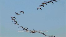 The Demoiselle Crane, Anthropoides virgo, is a species of crane found in central Eurasia, ranging from the Black Sea to Mongolia and North Eastern China. There is also a small breeding population in Turkey. These cranes are migratory birds. Birds from western Eurasia will spend the winter in Africa whilst the birds from Asia, Mongolia and China will spend the winter in the Indian subcontinent. The bird is symbolically significant in the culture of North India and Pakistan, where it is known as the koonj. The Demoiselle Crane is slightly smaller than the Common Crane but has similar plumage. It has a long white neck stripe and the black on the foreneck extends down over the chest in a plume. It has a loud trumpeting call, higher-pitched than the Common Crane. Like other cranes it has a dancing display, more balletic than the Common Crane, with less leaping.<br /><br />Demoiselle Cranes have to take one of the toughest migrations in the world. In late August through September, they gather in flocks of up to 400 individuals and prepare for their flight to their winter range. Along their arduous journey they have to cross the Himalayan mountains to get to their over-wintering grounds in India. Many die from fatigue, hunger and predation from birds such as eagles. Simpler, lower routes are possible, such as crossing the range via the Khyber Pass. However, their presently preferred route has been hard-wired by countless cycles of migration. At their wintering grounds, Demoiselles have been observed flocking with Common Cranes, their combined totals reaching up to 20,000 individuals. Demoiselles maintain separate social groups within the larger flock. The Demoiselle Crane is evaluated as Least Concern on the IUCN Red List of Threatened Species. It is one of the species to which the Agreement on the Conservation of African-Eurasian Migratory Waterbirds (AEWA) applies.<br /><br />Source: Wikipedia<br /><br />This footage is part of the professionally-shot broadcast stock footage archive of Wilderness Films India Ltd., the largest collection of HD imagery from South Asia. The Wilderness Films India collection comprises of tens of thousands of hours of high quality broadcast imagery, mostly shot on HDCAM 1080i High Definition, HDV and XDCAM. Write to us for licensing this footage on a broadcast format, for use in your production! We are happy to be commissioned to film for you or else provide you with broadcast crewing and production solutions across South Asia. We pride ourselves in bringing the best of India and South Asia to the world... Reach us at wfi @ vsnl.com and admin@wildfilmsindia.com.