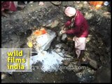 He died while meditating, in a sitting position! "Aakhri darshan kar lo, bhai!". Burial for a Hindu saint, as opposed to cremation. They surround the body with salt to aid in rapid decomposition.<br /><br />A shivling in a temple. People dig a pit in preparation for the burial of the dead sadhu. A mixture of ash is prepared to annoint the man of god, and off he goes... His eyes are swollen up and rigor mortis has set in. His followers take his clothes off and bathe the dead body. Even kids join in to the ceremony. Then they protect his modesty with a loin cloth and rub ash onto his body.<br /><br />Not for people with a weak heart, this is real footage never seen before. The footage is of the burial of a decomposing corpse of a Hindu sadhu in Madhya Pradesh, India. His followers or family members rub his lifeless body with some paste and then cover it with a cloth. This sadhu is being buried in a sitting position unlike common Hindus who are cremated. This is old footage and one can assume that the burial site must have become a place of worship by now. <br /><br />This footage is part of the professionally-shot broadcast stock footage archive of Wilderness Films India Ltd., the largest collection of imagery from South Asia. The Wilderness Films India collection comprises of thousands of hours of high quality broadcast imagery, mostly shot on HDCAM 1080i High Definition, HDV and XDCAM. Write to us for licensing this footage on a broadcast format, for use in your production! We are happy to be commissioned to film for you or else provide you with broadcast crewing and production solutions across South Asia. We pride ourselves in bringing the best of India and South Asia to the world... Reach us at wfi @ vsnl.com and admin@wildfilmsindia.com.
