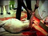 If you are weak hearted then you must be warned. This video shows a goat being sacrificed for Eid. Its an Islamic tradition to sacrifice Goat on Eid in the name of God! This is shot in Delhi. <br /><br />This footage is part of the professionally-shot broadcast stock footage archive of Wilderness Films India Ltd., the largest collection of imagery from South Asia. The Wilderness Films India collection comprises of thousands of hours of high quality broadcast imagery, mostly shot on HDCAM 1080i High Definition, HDV and XDCAM. Write to us for licensing this footage on a broadcast format, for use in your production! We are happy to be commissioned to film for you or else provide you with broadcast crewing and production solutions across South Asia. We pride ourselves in bringing the best of India and South Asia to the world... Reach us at wfi @ vsnl.com and admin@wildfilmsindia.com.