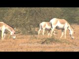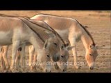 The very long unsheathed penis of a Wild Ass is visible as he walks along in the desert.<br /><br />Wild Asses (Equus hemionus khur) in Little Rann of Kutch, Gujarat, India. The Indian wild ass had a range that once extended from western India, through Sindh and Baluchistan, Afghanistan, and south-eastern Iran. Today, its last habitat comprises the Indian Wild Ass Sanctuary, Little Rann of Kutch and the surrounding areas of the Greater Rann of Kutch in Gujarat. The animal is also seen in the districts of Surendranagar, Banaskantha, Mehsana, and around Kutch. Saline desert, arid grassland and shrublands are its preferred habitat.<br /><br />Blackbuck National Park at Velavadar is situated in the Bhavnagar District of Gujarat state, India. Established in 1976 in the Bhal region of Saurashtra, the park is located around 72 km from the district headquarter city of Bhavnagar. Hugging the coasts of the Gulf of Khambhat on the south, it is spread over an area of 34.08 km², which was primarily a "vidi" (grassland) of the Maharaja of the princely state of Bhavnagar. On the northern side, it is surrounded by wastelands and agriculture fields. The National park has been classified as 4B Gujarat-Rajwada biotic province of semi-arid bio-geographical zone.<br /><br />This footage is part of the professionally-shot broadcast stock footage archive of Wilderness Films India Ltd., the largest collection of imagery from South Asia. The Wilderness Films India collection comprises of thousands of hours of high quality broadcast imagery, mostly shot on HDCAM 1080i High Definition, HDV and XDCAM. Write to us for licensing this footage on a broadcast format, for use in your production! We are happy to be commissioned to film for you or else provide you with broadcast crewing and production solutions across South Asia. We pride ourselves in bringing the best of India and South Asia to the world... Reach us at wfi @ vsnl.com and admin@wildfilmsindia.com.