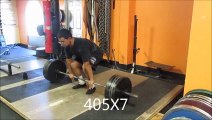 200X3 Clean 410X5 Deadlift 280X6 Front Squat 150X5 Oh Press