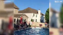 Epische basketbal dunk boven het zwembad