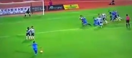 Ce jeune hollandais tente un coup du foulard sur un coup franc à 30 mètres et malheureusement le ballon frappe la barre. Il a bien failli marquer le but de l'année...