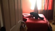 Cat Above Bed Sheet Fights Cat Underneath Sheet
